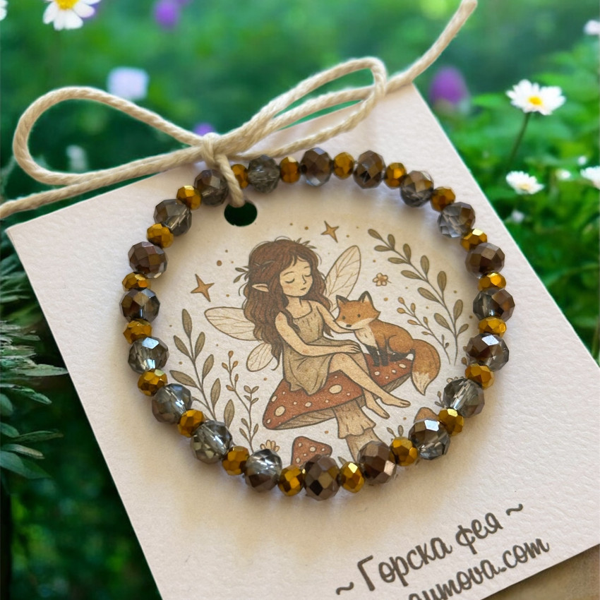 Изработена от фасетирани мъниста в медено, сиво и златисто. Цветовете напомнят на кехлибар, паднали листа и мекото сияние на есенното слънце. Лекотата и еластичната основа я правят удобна за ежедневно носене, а нежното поднасяне върху тематична картичка добавя артистичен чар.